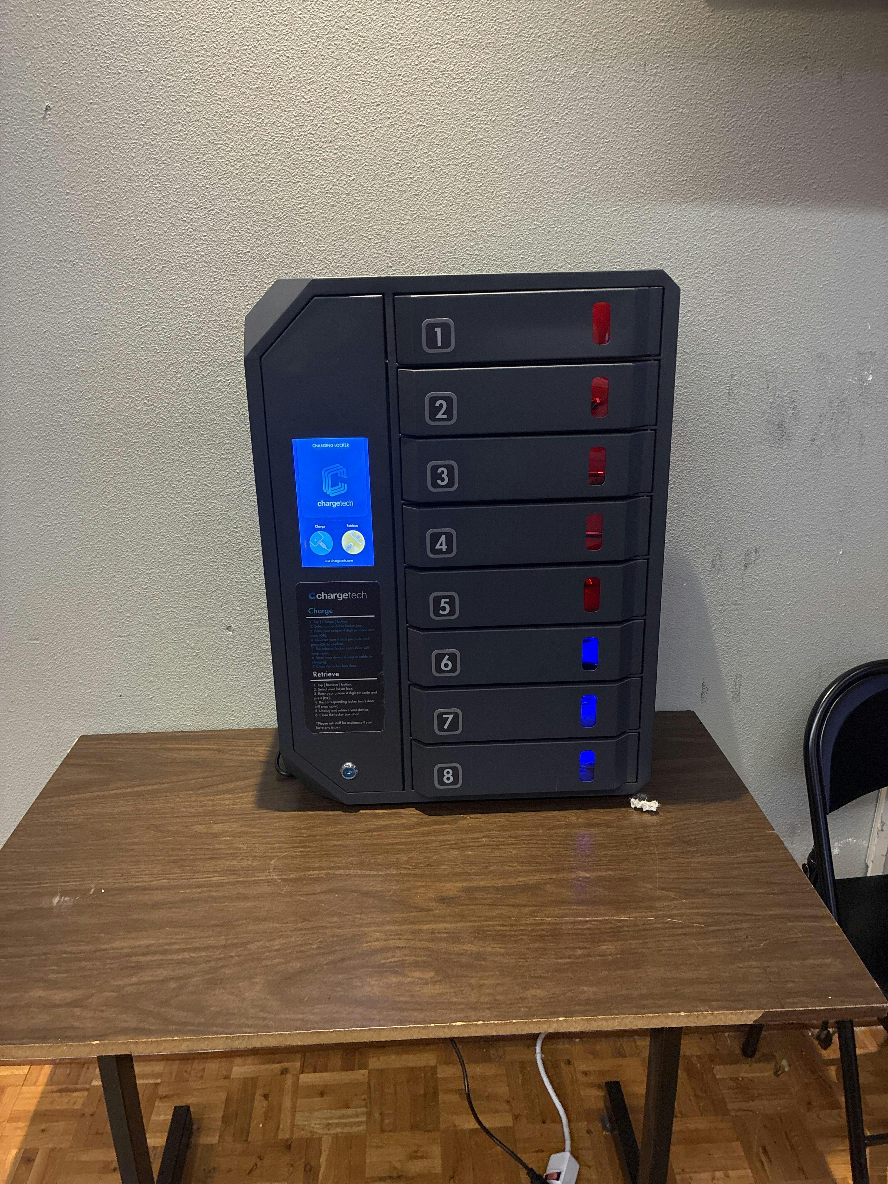 Our students love this! It's so intuitive to use, with a touchscreen and voice prompts, it takes less than a minute to pick an available charging locker, pick a passcode, plug in a device (Apple or USB-C), and secure it. Come back whenever, select your locker, enter the passcode, and retrieve the device.